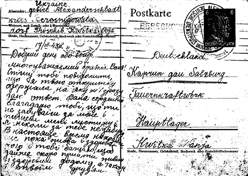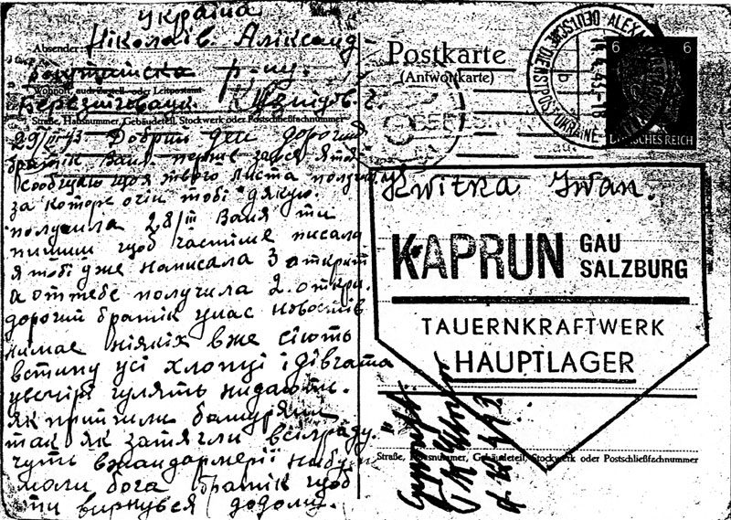 Some of the "guest workers" were Ukrainian - an estimated 2 million! They were provided with reply-paid cards to send and receive messages from their homes; the replies are cancelled ALEXANDERSTADT (UKRAINE) DEUTSCH DIENSTPOST UKRAINE.