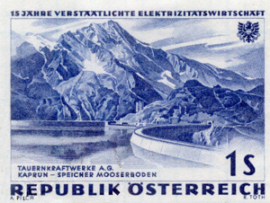 The large-scale production of electricity was entrusted to specialised companies organised as joint-stock corporations in which the federal state had to hold a share of at least 50 %. The Verbundgesellschaft, a central holding company entirely owned by the federal state, was created to ensure the large-scale distribution of energy in Austria. For that purpose, it operates a long-distance, high-voltage cable network, while provincial companies are responsible for the distribution to the consumers in the individual provinces. Additionally, there are municipal electricity utilities (in the provincial capitals) and power plants owned by industrial companies. Kaprun power plant, which is a storage power station, and the two dams shown in this stamp - Drossensperre and Moserbodensperre - were constructed in the years from 1952 to 1955.
