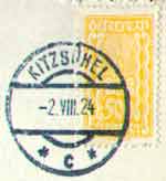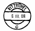 Standard bridge cancel (in use by July 1908). Many subtypes, all with sanserif KITZBÜHEL above date with month in roman numbers, various large or small letters with flanking 6- or 8-point stars below. Recorded 1907 - 1936. Here is a larger and better illustration. Stohl 6b10, 6b20, 6c20 |