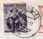 When it was decided in the middle of 1948 to introduce a new definitive set of stamps, it was necessary to select a topic which would be not only of general appeal but also representative of the whole of Austria. The final decision was to use an idea which had proved very popular in 1934-36, namely to use the traditional costumes of Austria as the theme. Professor Josef Seger (b.1908), a pupil of Alfred Cossmann, who had studied at the Graphical Teaching and Research Institute in Vienna and then at the Academy of Pictorial Art, was selected as the designer of this set. The Museum of Folk Art in Vienna did the original research for the costumes. It had long been believed that one of his girl students, whose likeness is most apparent on the 50g stamp, posed for Professor Seger's drawings; but it is now known that there was no model, the designs being a purely intellectual creation.