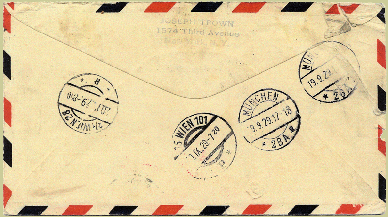 Sept 1929: This is Catapult mail from New York (the sender's address is faintly visible on the back) to Vienna; the aeroplane was catapulted from the 'Bremen' as it approached Cherbourg, and landed at Munich. [All these flights are extensively documented, down to the names of the crew.] WIEN 101 is Westbahnhof - perhaps it came from Munich by overnight train - and WIEN 28 is Nordbahnhof where it arrived at 8:40 am. Schwaigergasse, the delivery address, is across the Danube in Floridsdorf.