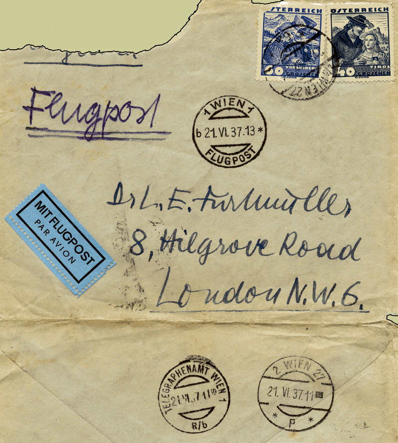 June 1937: Sent by airmail from Vienna to London on 21 June 1937. Cancels show route from Vienna 27 pneumatically to Telegraphenamt. Carries 100 groschen, making up the 20-gram foreign letter rate of 60gro plus airmail surcharge of 40gro.