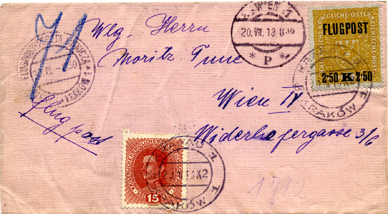 Daily from March 31 until October 15 in 1918, Austria operated the first regularly scheduled airmail route in the world (Wien-Krakau-Lemberg-Kiew). Airmail was classified as express service and forwarded pneumatically whenever this would expedite delivery. Franking 15H postage + 1.50 Kreuzer airmail per 20 grams + 1.00 Kreuzer per flight step (Krakau-Wien). The faint "1712" is the acceptance number.