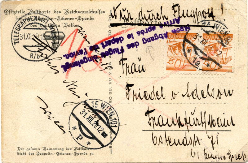 31 Dec 1929: Vienna to Germany. Posted at 14 WIEN 98 (Fünfhaus II), entered system at 15 WIEN 101 (Westbahnhof). Arrived at Central Telegraph Office an hour later where crayon 1/5 added indicating airport destination. However the delay resulted in 2-line cachet "Arrived after departure of the aeroplane".