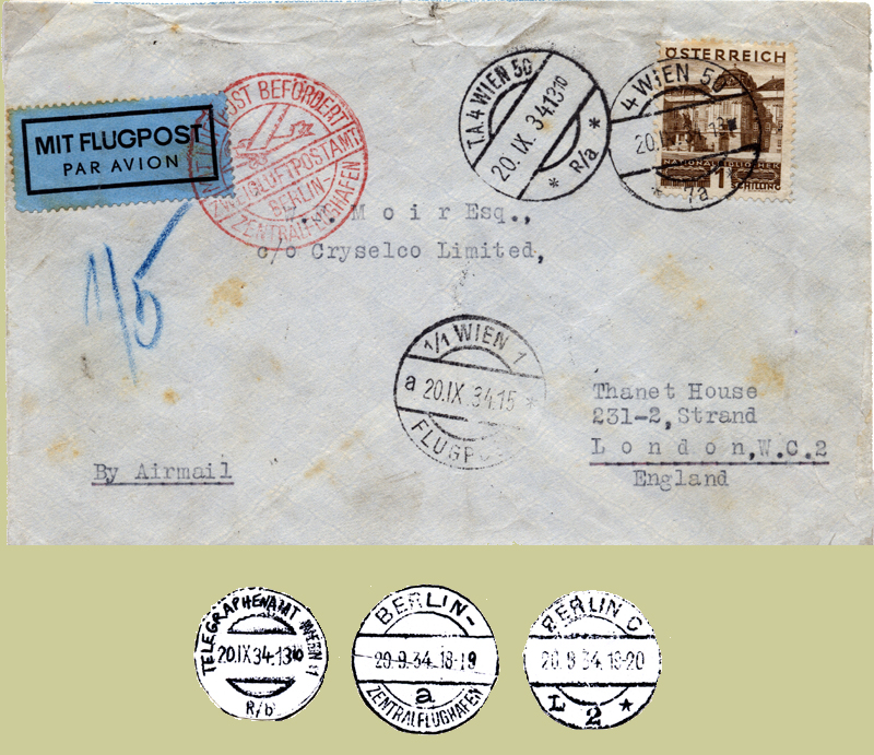 20 Sep 1934: Vienna to England. From 4 WIEN 50 (Wieden) to T.A. WIEN 50 - the telegraph office - thence to the airport (crayon 1/5) via the Central Telegraph Office.