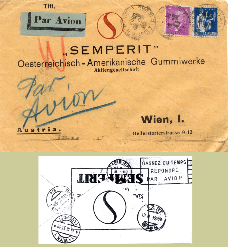 18 Mar 1935: Paris to Vienna. Usual arrival FLUGPOST with crayon W for pneumatic transmission to T.A.WIEN 1 and T.Z.St. for inner-city delivery.
