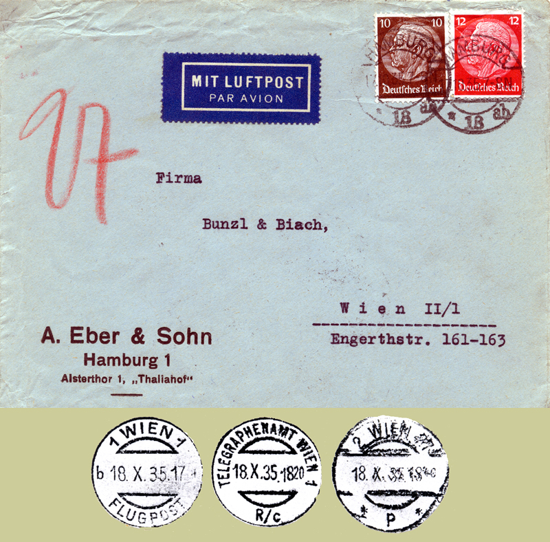 17 Oct 1935: Germany to Vienna. From Hamburg to 1 WIEN 1 / Flugpost to T.A.WIEN 1 to 2 WIEN 27 (Praterstrasse). Red crayon 27.