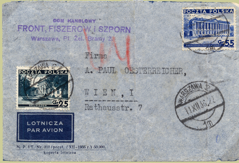 11 Dec 1936: Poland to Vienna. Wien 1 Flugpost to T.A. 1 to 8 WIEN 64 as per the red crayon