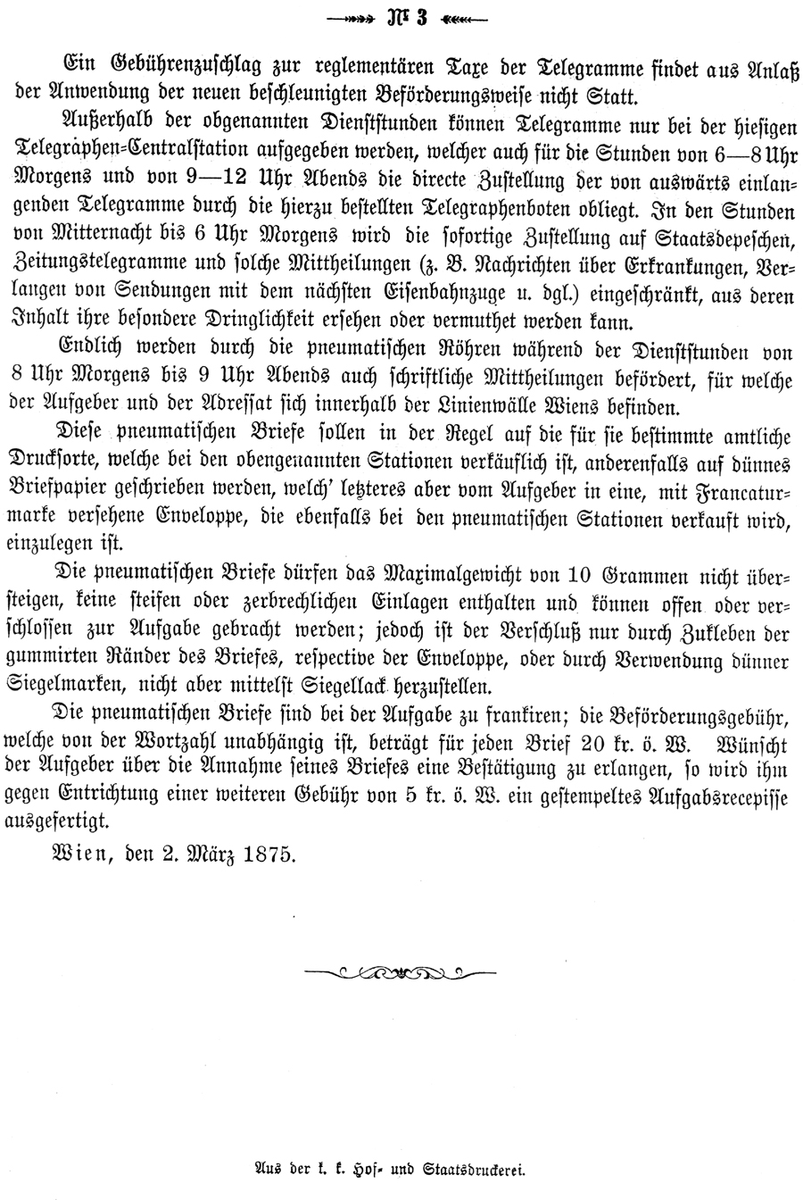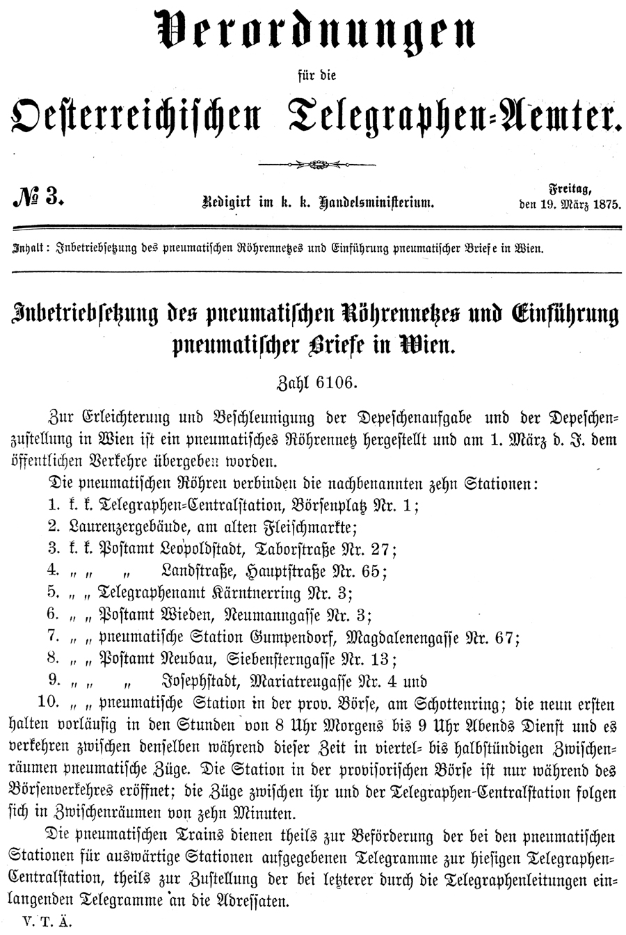 The "Ordinances for the Austrian Telegraph Offices" No. 3 of 19th March 1875 announced the "starting of the pneumatic pipe system and introduction of pneumatic letters in Vienna with effect from 1st March of this year". The commonly-quoted text of the Ordinance contains a few errors; however some of these (eg the details of the 10th station) are of crucial importance! This article contains (i) a free but not deliberately wrong translation; (ii) a transliteration of the Ordinance; (iii) a facsimile. {Notes} are author's footnotes and are placed at the end of the translation.