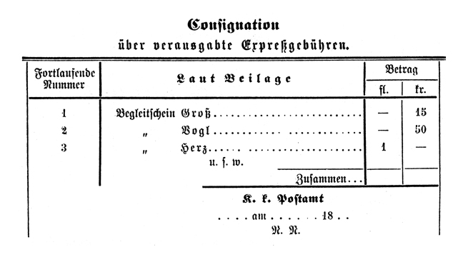 The settlement of these fees takes place "zur R.XVI", that is, by the ärarisch Offices in the same way as for telegrams; but for the non-ärarisch Offices by means of a Consignation (Post Office Form 170) [see below], which is to be accompanied by the delivery note from the pneumatic Office (Post Office Form 169) listing the items handed over.