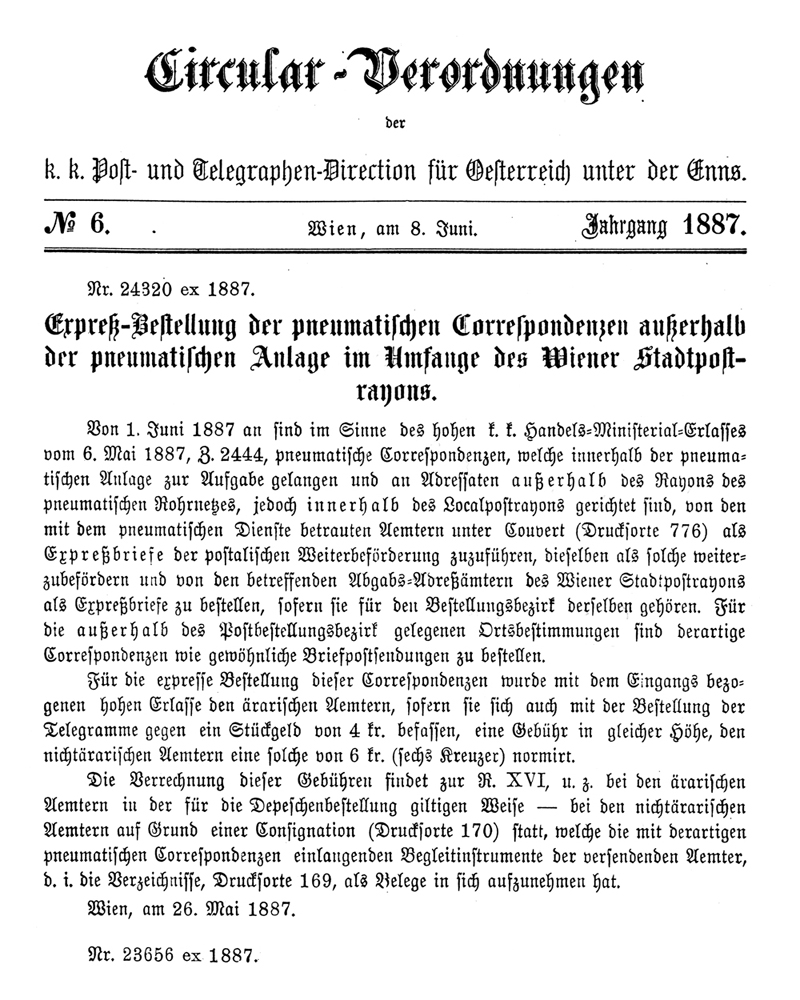 Von 1. Juni 1887 an sind im Sinne des hohen k.k. Handels-Ministerial-Erlasses vom 6. Mai 1887, §2444, pneumatische Correspondenzen, welche innerhalb der pneumatischen Anlage zur Aufgabe gelangen und an Adressaten außerhalb des Rayons des pneumatischen Rohrnetzes, jedoch innerhalb des Localpostrayons gerichtet sind, von den mit dem pneumatischen Dienste betrauten Aemtern unter Couvert (Drucksorte 776) als Expressbriefe der postalischen Weiterbeförderung zuzuführen, dieselben als solche weiterzubefördern und von den betreffenden Abgabs-Adreßämtern des Wiener Stadtpostrayons als Expreßbriefe zu bestellen, sofern sie für den Bestellungsbezirk derselben gehören. Für die außerhalb des Postbestellungsbezirk gelegenen Ortsbestimmungen sind derartige Correspondenzen wie gewöhnliche Briefpostsendungen zu bestellen.