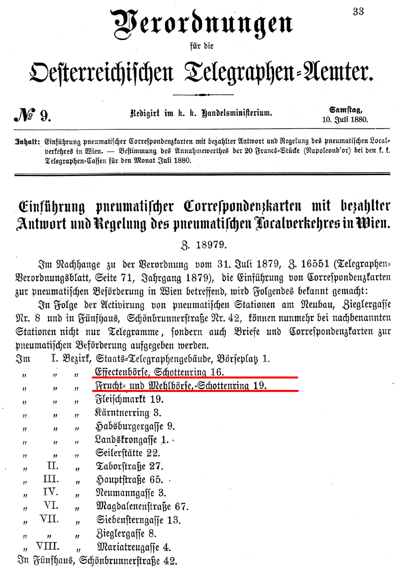 Telegraph Regulations, 10 July 1880: note the two Börses and their addresses.