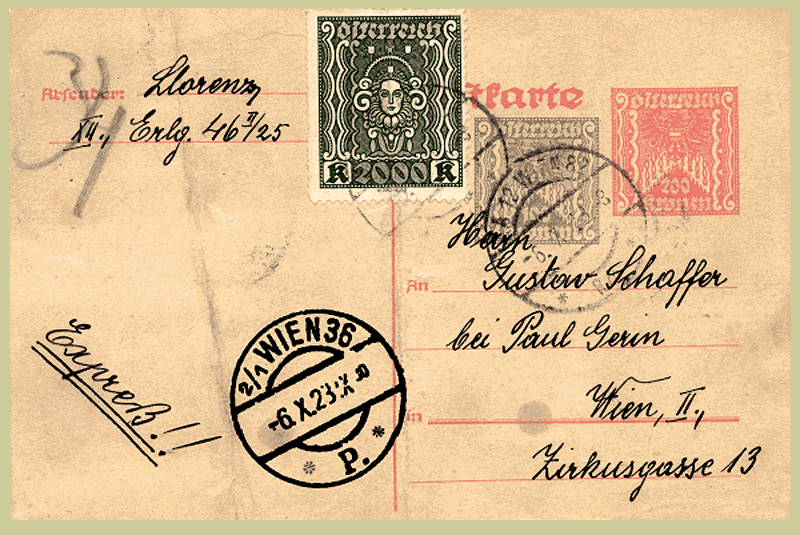 Used 6 Oct 1923 from Station 82 to Station 36. Inflation Period III: 200Kr card with 100Kr added imprint and 2000Kr adhesive, making up the 2300Kr rate.