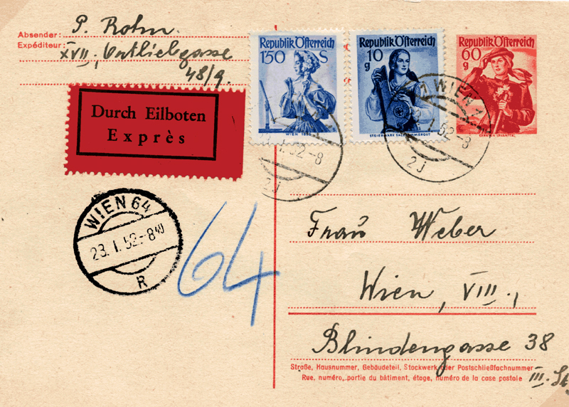 Postal Stationery card with additional adhesives to make up local postage of 70gr plus express of 1S50.Arrival cancel WIEN 64 without district number.