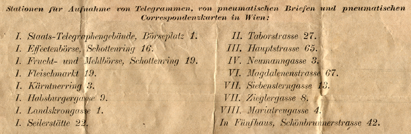 Fluck continues: [During] further search at the Post and Telegraph Museum, Wien a map "Pneumatisher Telegraph In Wien" dated 1875 was discovered listing the first ten stations as established by the collection [with special thanks to Herr Leopold Holub]. Thus based on the postal stationery of the Pneumatic Post, the notations of the sending station postal clerks, and the circular receiving stations name cancellations, the first ten station numbers and names are as listed.