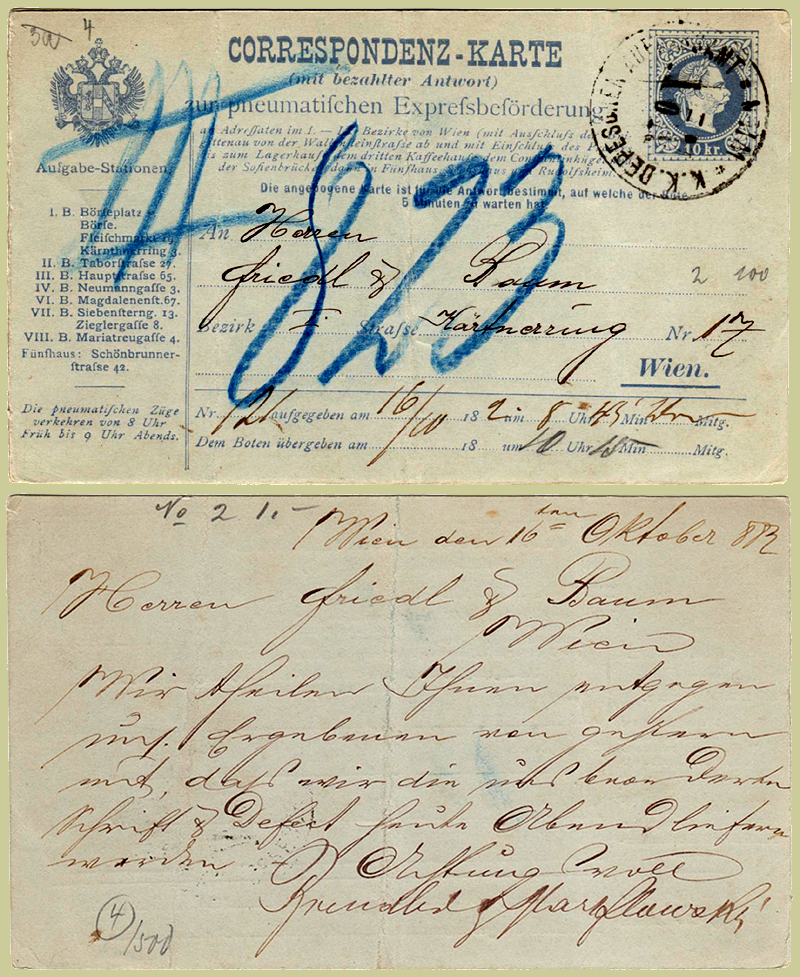 The card shown here, dated 16 October 1883, has a circular cancel with sanserif K K DEPESCHEN-AUFGABSAMT surrounding seriffed No V. It was sent to Friedel & Baum at Kärntnerring 17. The pencil markings are by dealers. The III in blue and 823 in a different blue are not normal pneumatic markings; however the Kärntnerring station was numbered 3 until 1892. The 823 cannot be the transmission number as that is handwritten at the bottom and is 121. This shows that KKDA-V is not Kärntnerring. [The pencilled 4-in-ring and 500 at the bottom of the back will be a society packet reference and price!]