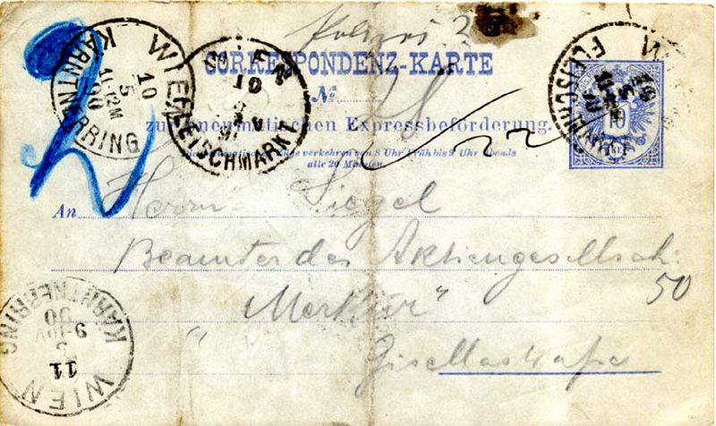 Kärnthnerring changed Instradierungs-chiffre from 3 to 2 and returned the message. Fleischmarkt 2nd cancellation is a receiving mark – they didn't mark the card again when they sent it back with the complete address. Probably early on May 11, because they added a new sequential number "22".