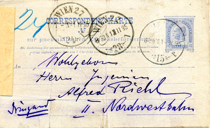 Messenger attached the slip "Addressee A.Riehl Norwth/terminal no more to deliver hereby. ________? II, Holzhausergasse 4. (signed) Wanceck"