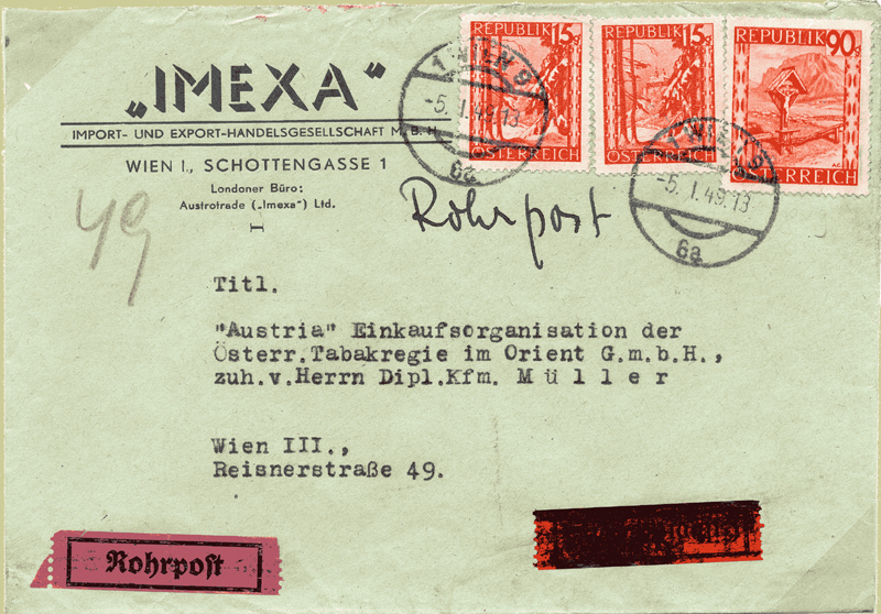 After 1925, when regular postage stamps and cancellations were used, the sender would mark the item with "Rohrpost" or simply "R". If the proper postage had been paid, it would then be transmitted by the pneumatic system. The next example shows this; date 5 Jan 1949. Note how the "Eilbote" label has been crayoned out; the franking of 120G paying the surface and pneumatic charges but not the express delivery.