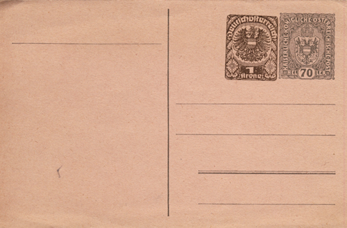 The 1Kr imprint added to the official 70h postcard would cover an express postcard during inflation period 3 (15.4.1920 - 31.1.1921) when the postcard rate was 50h and the express 1.20k.