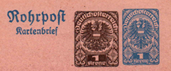 The most useful and extensive listing of Pneumatic Post stationery is that provided by Dr Ascher's "Grosser Ganzsachen-Katalog" (Berlin 1928). All the various types of specially printed envelopes, letter cards and postcards are described in some detail though he does not deal with the flap variations on the envelopes or perforation varieties on the letter cards. So long as it was adequately prepaid, ordinary postal stationery could be sent by the Pneumatic Post, and such items - not included in the Ascher catalogue, and not listed here - are much sought after. [In the Schilling period, there was no Pneumatic Post stationery and ordinary items were used.]