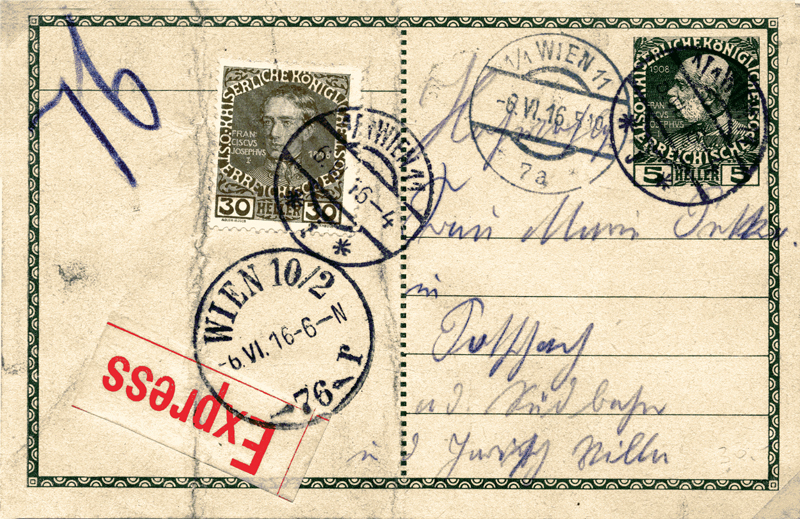 5 Heller Jubilee postcard, posted from Vienna to Hofrathg(attin?) Frau Mimi Something in Pöltschach a d. Südbahn, with added 30 Heller adhesive to make up the Express rate. Posted 6 June 1916 from Station 11 Bräunerstrasse to Station 76 Südbahnhof, then onwards by train.