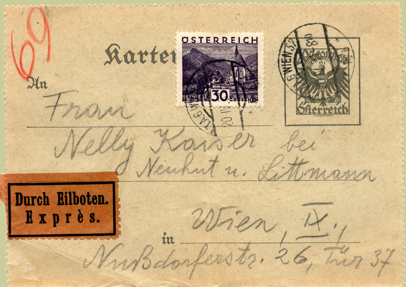 20 groschen letter card from and to Vienna, April 1934 with express fee of 30 Gro added. The postal service chose to send it pneumatically. If the sender had explicitly requested pneumatic handling, it would have cost 54 groschen and got there no faster.
