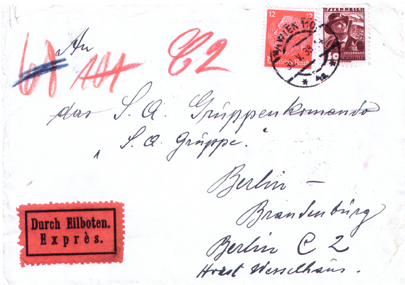 Vienna to Berlin, 30 May 1938. The sender has specified Express and franked the item 12 Rpf + 30 Groschen which is correct for the period as tabulated above. As is common, each rate was paid by an adhesive of the appropriate value. The item was handled by Rohrpost in Vienna and also in Berlin; in both cases because it was the quickest available method of providing the Express service that the customer had paid for.
