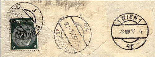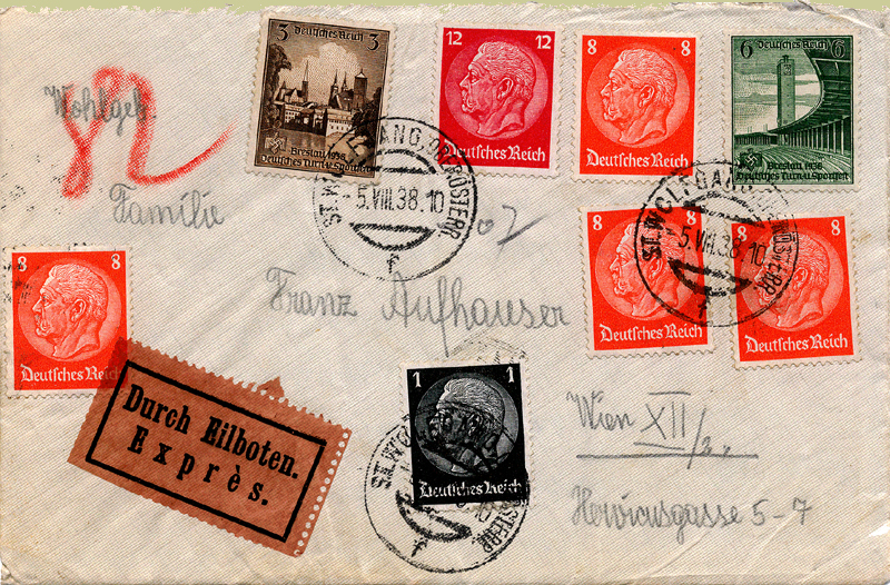 This cover (front and part of back shown above) was sent from St Wolfgang to Wien; 5 Aug 1938. Light brownish express label. Franked 54Rpf on front & 6Rpf on back; total 60Rpf. Letter rate 12Rpf + express fee 40Rpf + pneu fee 10Rpf makes 62Rpf. Perhaps the pneumatic component was deemed irrelevant, in which case it’s 8Rpf overfranked.