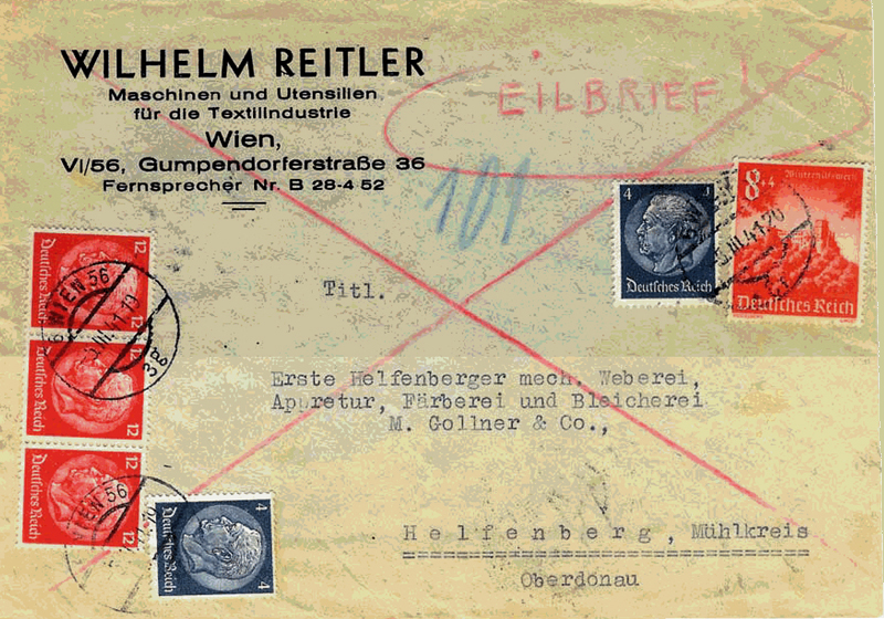 This cover went from 6 WIEN 56 to Helfenberg in Mühlkreis; 5 Mar 1941. Cancels WIEN 57 and 15 WIEN 101 (Westbahnhof) on the back. Full letter rate 12Rpf + express fee of 40Rpf = 52Rpf; franked 3x12Rpf + 2x4Rpf + 8Rpf = 52Rpf. No pneumatic fee charged.