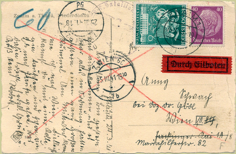 Znaim to Wien; 24 Mar 1941. Postcard rate 6Rpf + express fee 40Rpf = 46Rpf; franked 40Rpf + 6Rpf = 46Rpf. Used the pneumatic system, but no surcharge applied or levied.
