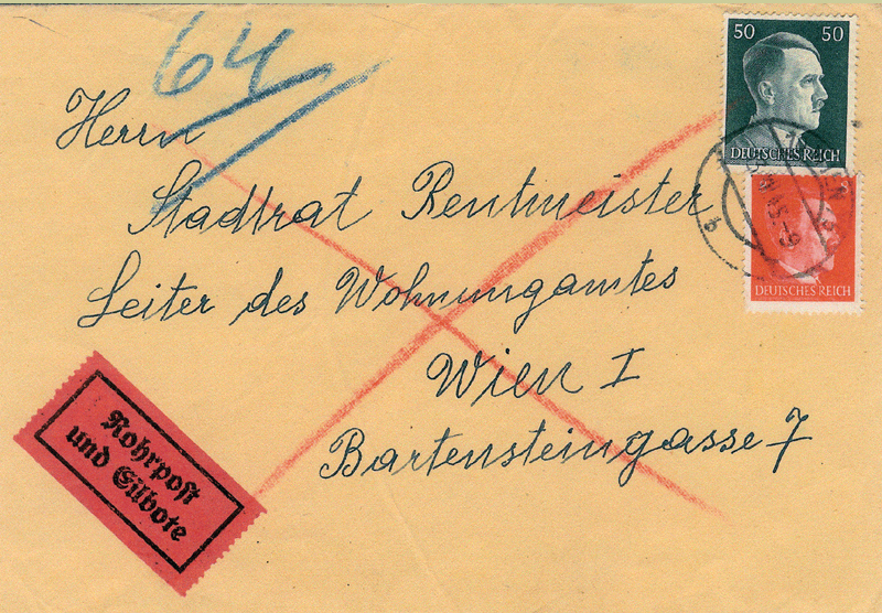 Local letter of 26.3.1941. Pneumatic handling and Express delivery both specified. Adhesives for 58Rpf covering the local letter rate of 8Rpf, Pneumatic surcharge of 10Rpf, and Express rate of 40Rpf. WIEN 64 R cancel on back