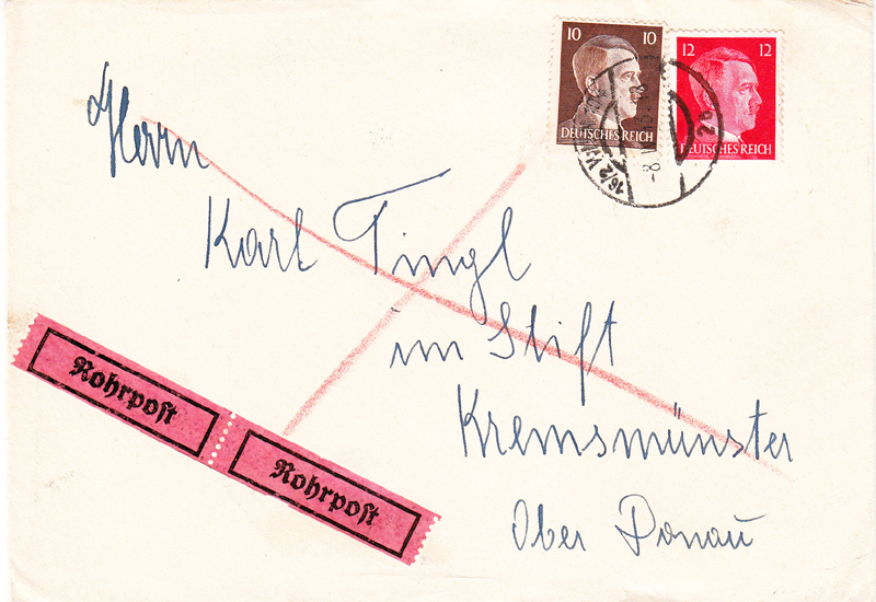 Posted 8 April 1943. Inland letter (rate 12Rpf). Has Rohrpost label, and added franking of 10Rpf which was the pneumatic fee. Conclusion: expedited to railway station then sent onwards in normal way.