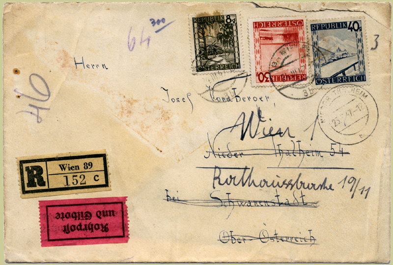 Inland Registered letter posted Monday 24.3.1947. The sender’s address is Wien 13, Gloriettegasse 35, and he posted it at office 13/1 Wien 89 (which by then was in Hietzing) to Nieder Thalheim 54 (**) arriving Tuesday 25.3.1947. The letter was redirected back to Wien 1, Rathausstrasse 19/11 via Station 64 (faint Instradierungs-Chiffre in violet crayon to left of 8g stamp) arriving back on Friday 28.3.1947 (cds on reverse). Office 64 was Josefstadt in Bezirke VIII; it is now called Wien 1082, and is still located at Mariatreugasse 4-6. Rathausstrasse is in Bez. 1 and 19/11 is the 11th apartment at number 19, which is at the University end. Mariatreugasse is quite close, and also is the nearest pneumatic station; and it was working in 1947.