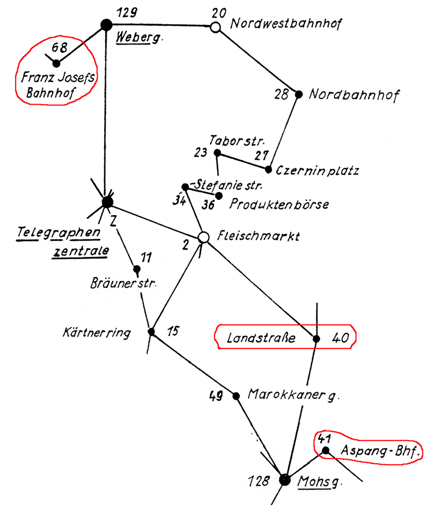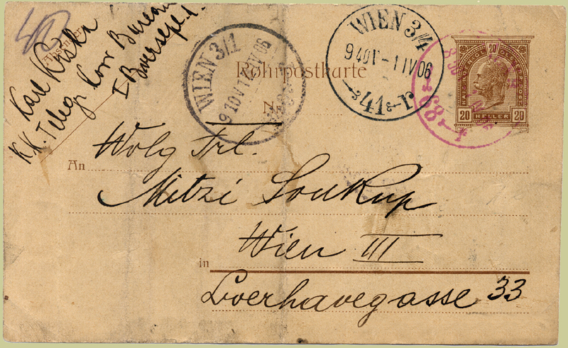 This item was sent at 08:50 from Wien 9/1 68 (Franz Josef Bahnhof) to Wien 3/1 40 (Landstrasse) where it arrived at 09:10. They sent it on to Wien 3/4 41 (Aspangbahnhof) where it arrived at 09:40. Why? No staff, no time, it’s closer? Unusually, the despatch cancel is in violet-red; the item has the normal three vertical creases.