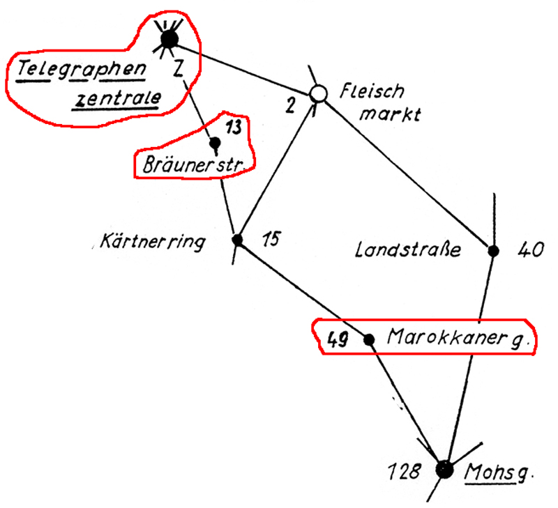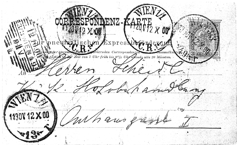 Schraffenstempel 3/3 Wien 49 10-11V dated 12 Oct 1900. Pneumatic cancel Wien 49 at 10:50. Intended for Wien 13 (at Bräunerstrasse 4-6 in 1900) but misrouted or mishandled, arriving at Centrale (CR) at 11:20. They applied two cancels and sent it to Wien 13, arriving at 11:30.