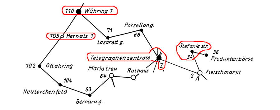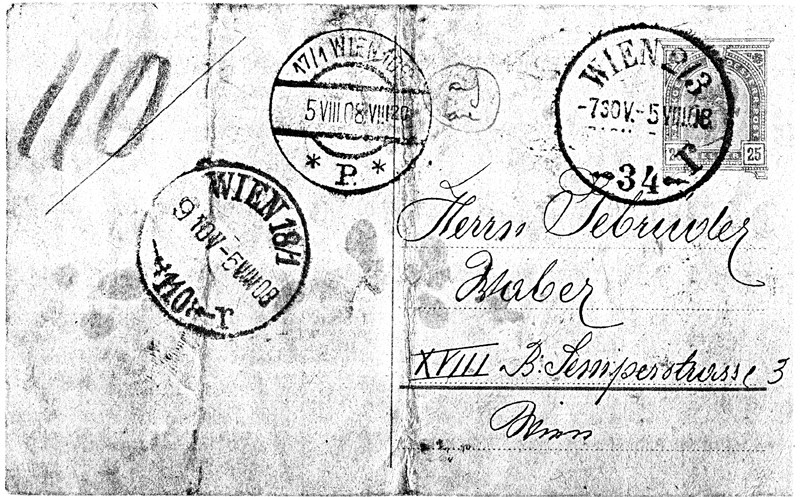 Wien 34 at 07:30 to Zentrale to Wien 105 at 08:20 to Wien 110 at 09:10, all on 5 Aug 1908.