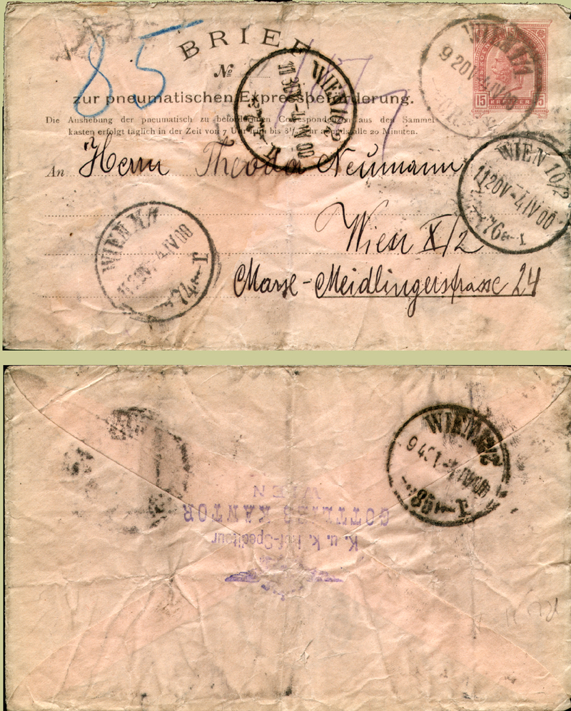 This item seems to have been a "pass the parcel" object! It started at the central post office, receiving a WIEN 1/1 cancel at 9:20am and a directional '85' which is Gaudensdorf at III Schönbrunner Haupstrasse. The address is X Marx-Meidlingerstrasse, up the hill - so a routing to Gaudensdorf looks reasonable. On the back is a Gaudensdorf cancel timed at 9:45am. However it was then sent on a tour of the Bezirk X Sudbahnhof-Favoriten area, being cancelled at Wien 76 Sudbahnhof at 11:20, Wien 74 Favoriten also at 11:20, and Wien 76 Staatsbahnhof at 11:30. Hopefully it was then delivered!