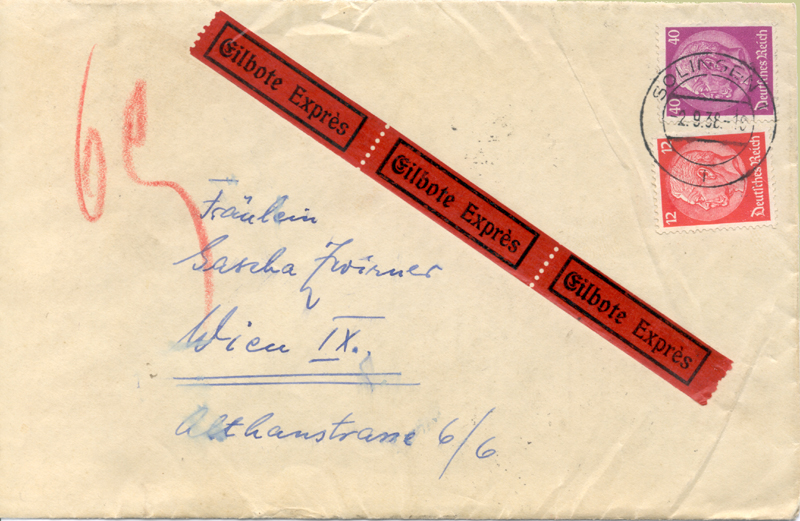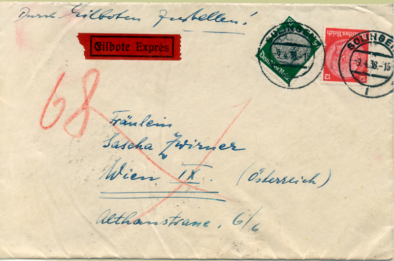 These two letters were sent from Solingen (in Germany near Dusseldorf) to the same address (Althanstrasse 6/6) in Vienna, yet were handled differently. Why? The first is dated 9 April 1938; it arrived in Vienna the next day as shown by the indistinct Telegraph Office cancel on the back [illustrated left], and the red 68 on the front which matches the 9 WIEN 68 cancels on the back. Office 68 is at Franz Josef Bahnhof - indeed Althanstrasse passes its front door! The 10th of April, when this letter arrived, was a Sunday.