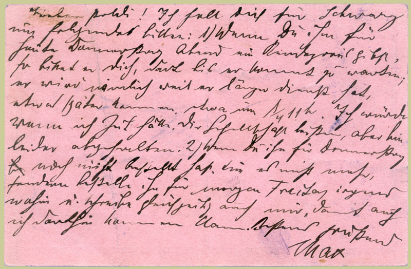 | Lieber Poldi! Ich soll dich für Schwarz um folgendes bitten: 1) Wenn Du ihn für heute Donnerstag Abend ein Rendezvous gibst, so bittet er dich, dass bis er kommt zu warten, er wird nämlich weil er länger Dienst hat, etwas später kommen, etwa um ¼ 11h. Ich würde wenn ich Zeit hätte dir Gesellschaft leisten, aber bin leider abgehalten. 2) Wenn Du ihn für Donnerstag noch nicht bestellt hast, tue es nicht mehr, sondern bestelle ihn für morgen Freitag irgend wohin u. schreibe gleichzeitig auch mir, damit auch ich dorthin kommen kann. Bestens grüssend, Max | Dear Poldi! I would ask you the following on Schwarz behalf. 1) If you make an appointment for today, Thursday, evening, he would like him to wait until he gets there, he will in fact get there a bit later, at around 10:15, as he is on duty longer. If I had time I would accompany you but am unfortunately unable to do so. 2) If you have not yet made an appointment with him for Thursday, don’t do it now, but make one with him for tomorrow, Friday, somewhere or other and write to me at the same time as well so I can also be there. Best regards, Max |