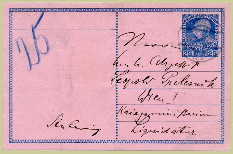 There is a clear 25 in blue crayon at the top left corner and the delivery address is Wien I / Kriegsministerium / Liquidatur. The card has the standard three creases, so that the item can fit in the pneumatic Büchse; they appear contemporary not modern. The cancel 1/1 WIEN 1 would only have been applied to items posted at that office, or posted in a red pneumatic-letter-box whose contents were taken to that office. The creasing was done by the Büchse-fillers (sometimes they chose to roll items) not the cancelling clerks.