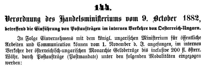 (and so on for 2½ pages plus a form). As was customary, the text of the Decree was repeated verbatim in a Postverordnung, Nr 84 dated 17 Oct 1882, with the addition that this new system would be publicised in the regional newspapers, and that the existing C.O.D. system remained unchanged. The Postverordnung was accompanied by three pages of Durchführungs-Bestimmungen giving explanatory details for the postal employees, and details of the reverse of the form and of the dual-language versions.