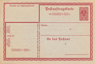94: Postauftragskarte can be used to claim up to 20Kr; accompanying documents are impossible; they have an imprinted 10h stamp to cover the postage and are sold by the Post Office at 10h; privately-produced cards are forbidden. They are a 2-part card [similar to the Postauftrag of para 91].