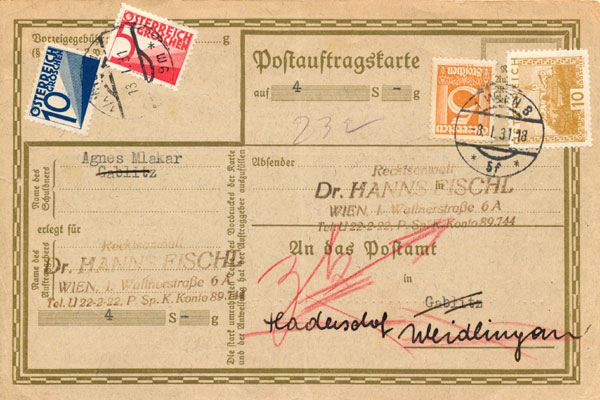 2. As I understand the system, the Postanweisung generated by a Postauftrag is handled the same way as one handed over the counter. It's an instruction to the money side of the Post Office (the Postsparkasse) to remit money to somebody. All such went via Otto Wagner's Postsparkasse building in Vienna, even if from Innsbruck to Igls. The form brought to the recipient’s door (that he couldn't have) was not the same form as the originator had filled in. Indeed, with later versions of the system whereby payments could be made from or to a named P.O. account, Vienna would certainly have kept the original as authorisation for shifting the money.