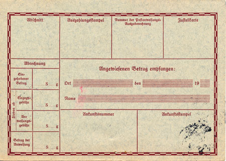 The system was converted to the German one, which achieved similar ends using slightly different details. A Zahlkarte is sometimes encountered, especially in the Russian Zone until Dec 1945; It is an alternative remittance method alongside the Postanweisung.