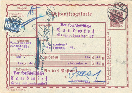This is an Auftragspostanweisung, prepared so that the municipal authorities of Weidenegg could pay 14Sch40 into a Postsparkassen account to benefit "The Progressive Farmer" (probably a newspaper) in Graz. It’s unfranked and crossed out in blue so can’t have been used – although it could have been sent to Weidenegg in an envelope with a covering letter or invoice. Sometimes the rejected Postauftragskarte- Auftragspostanweisung pair were returned by the Post Office glued together; this shows the system to advantage but is difficult or impossible to make into an illustration!
