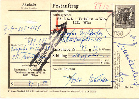 This Postauftrag is a request dated Feb 1971 from the Finanzamt für Gebühren und Verkehrsteuren in Vienna (they dealt with requests to postpone the payment of taxes) to someone in Amstetten to pay 47Sch 10gro. They didn’t, so the card was returned.