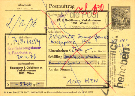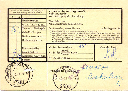 In the last week of February 1981, complex transitional arrangements were in force: this was to avoid difficulties when the system changed: from 1 March, the sender had to prepay (with postage stamps) the fees for remitting back the money, from which no deductions were made. The remittance would come to a Post Office account that the sender had specified; cash delivery was still available but at an extra fee. This may not have applied if the sender was a governmental organisation; this undelivered Postauftrag from the Finanzamt für Gebühren und Verkehrsteuren dated July 1997 was returned without any visible prepayment.