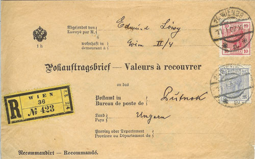 The new service is simplest to explain by an example. Let’s say that Bob wishes Alice to pay him 100 Gulden for something. Bob goes to a Post Office or a Stamp Reseller, buys a Postauftrag form for ½kr. and fills it in. He puts the form plus his supporting ‘Anlage’ (eg his invoice, bill of exchange, begging letter etc) in an envelope which he supplies; he decides if he wants only one delivery attempt to be made (if yes, he writes "Sofort zurück" on the back of the Postauftrag form); he addresses the envelope to Alice’s Post Office [not to Alice; her details go on the form]; and he takes it to his own. They check the details and enter them in their registers; and sell him adhesives to cover postage plus registration. These are applied to Bob’s envelope which is then transmitted to Alice’s Post Office as a registered letter. There were restrictions: