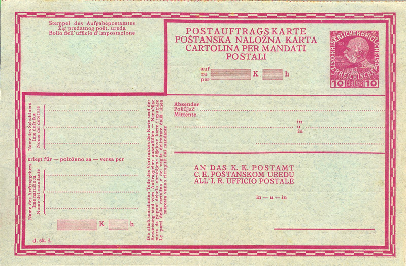From 1 July 1913 a new stand-alone Postauftragskarte appeared; it was for claiming small amounts up to 10Kr (typically magazine subscriptions and the like). An inclusive charge of 10h was made, shown by a 10h imprint. An Auftragspostanweisung formed a second part, which the sender also filled in. This is the three-language German-SerboCroat-Italian version. From 1 November these cards could be sent to and from Bosnia-Hercegovina and the Sandjak.